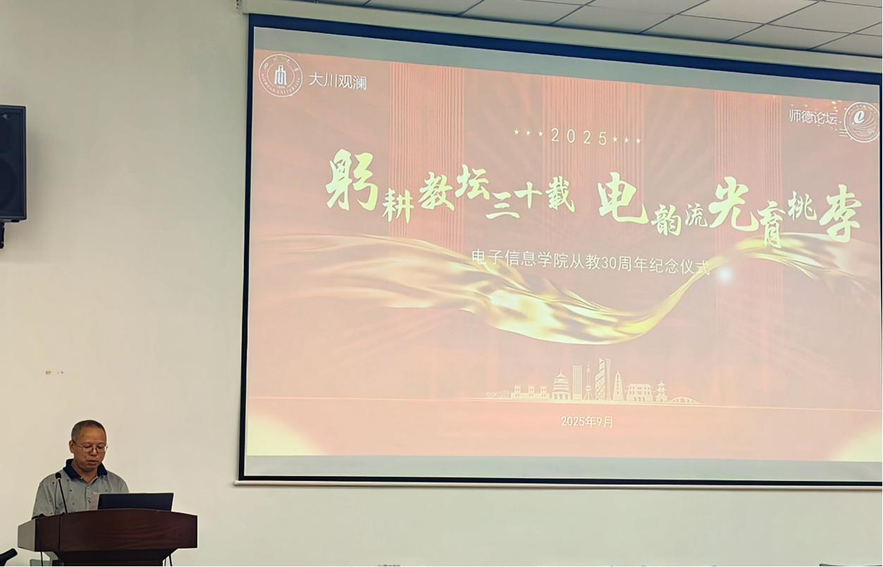 仪式由学院党委副书记廖勇明主持。会议伊始,主持人以“江安河畔,书声琅琅;望江楼旁,银杏金黄”的诗意开场,引领全场回顾了三十载春秋里,老师们在三尺讲台上的默默坚守与无私奉献。会议指出,正是这批可敬的师者,将人生最宝贵的年华毫无保留地奉献给了川大bat365在线体育登录,用智慧与汗水为祖国电子信息事业描绘了宏伟蓝图,用坚守与热爱谱写了学院发展的熠熠篇章。