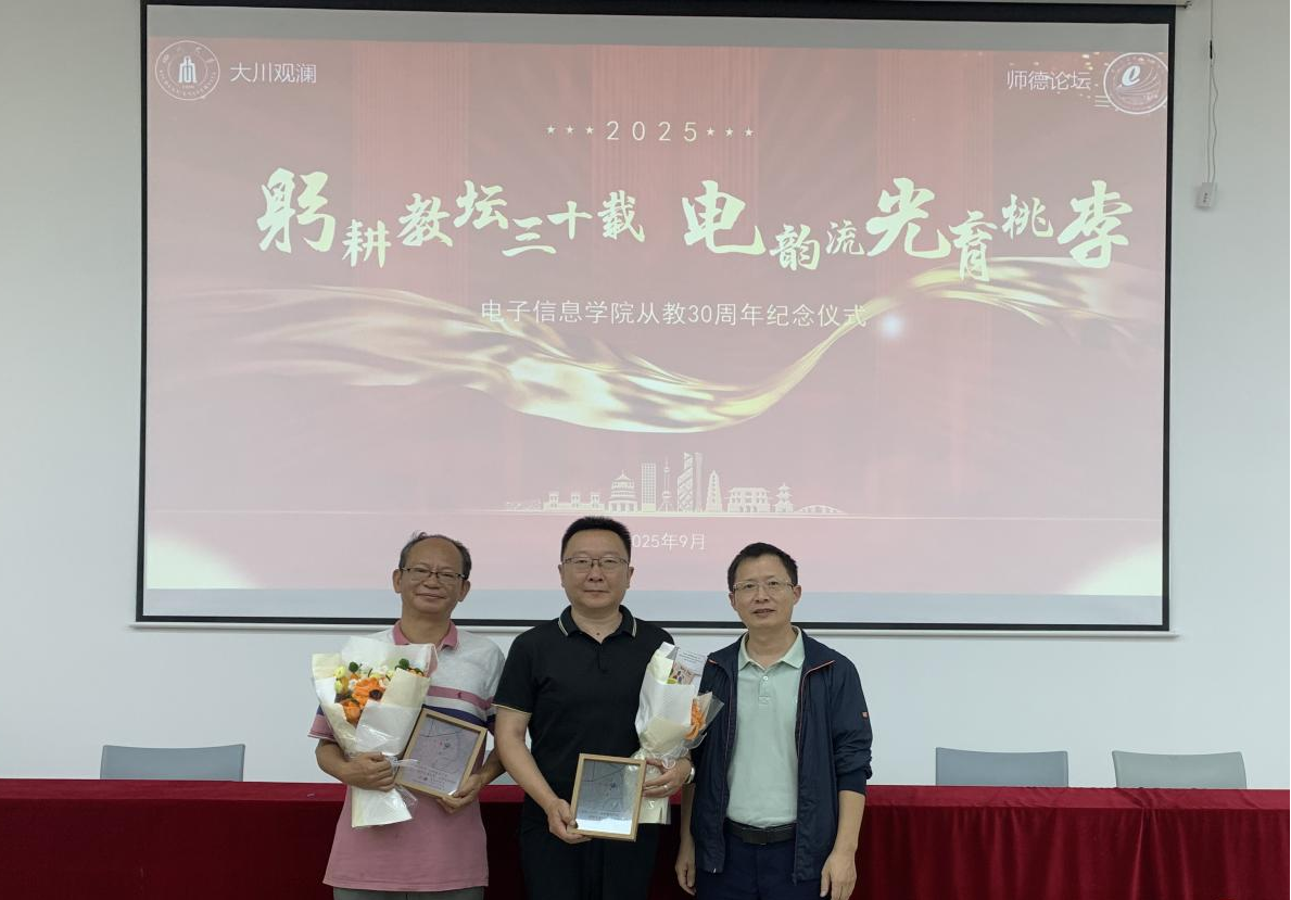 致敬卅载芳华,传承师者匠心。2025年9月28日下午,四川大学望江校区西五教附101会议室内暖意融融、掌声雷动,bat365在线体育登录大川观澜师德讲堂“躬耕教坛三十载 电韵流光育桃李”——从教30年纪念仪式在此隆重举行。学院全体教师以最崇高的敬意,为将毕生心血奉献给教育事业的三位老师举行了一场简朴而庄重的致敬典礼。