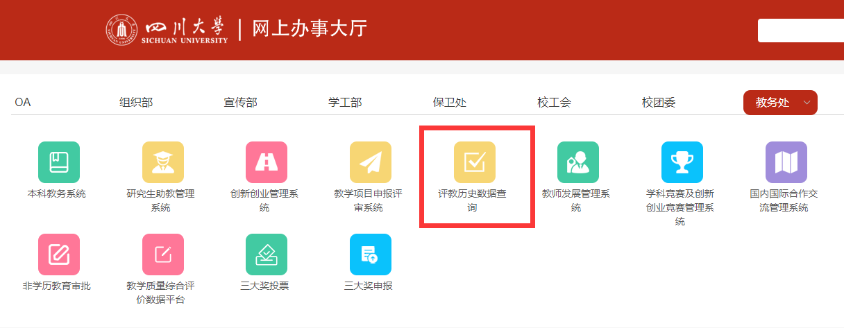Ⅱ.进入网上办事大厅在单位菜单栏处选择教务处”——“评教历史数据查询图标。