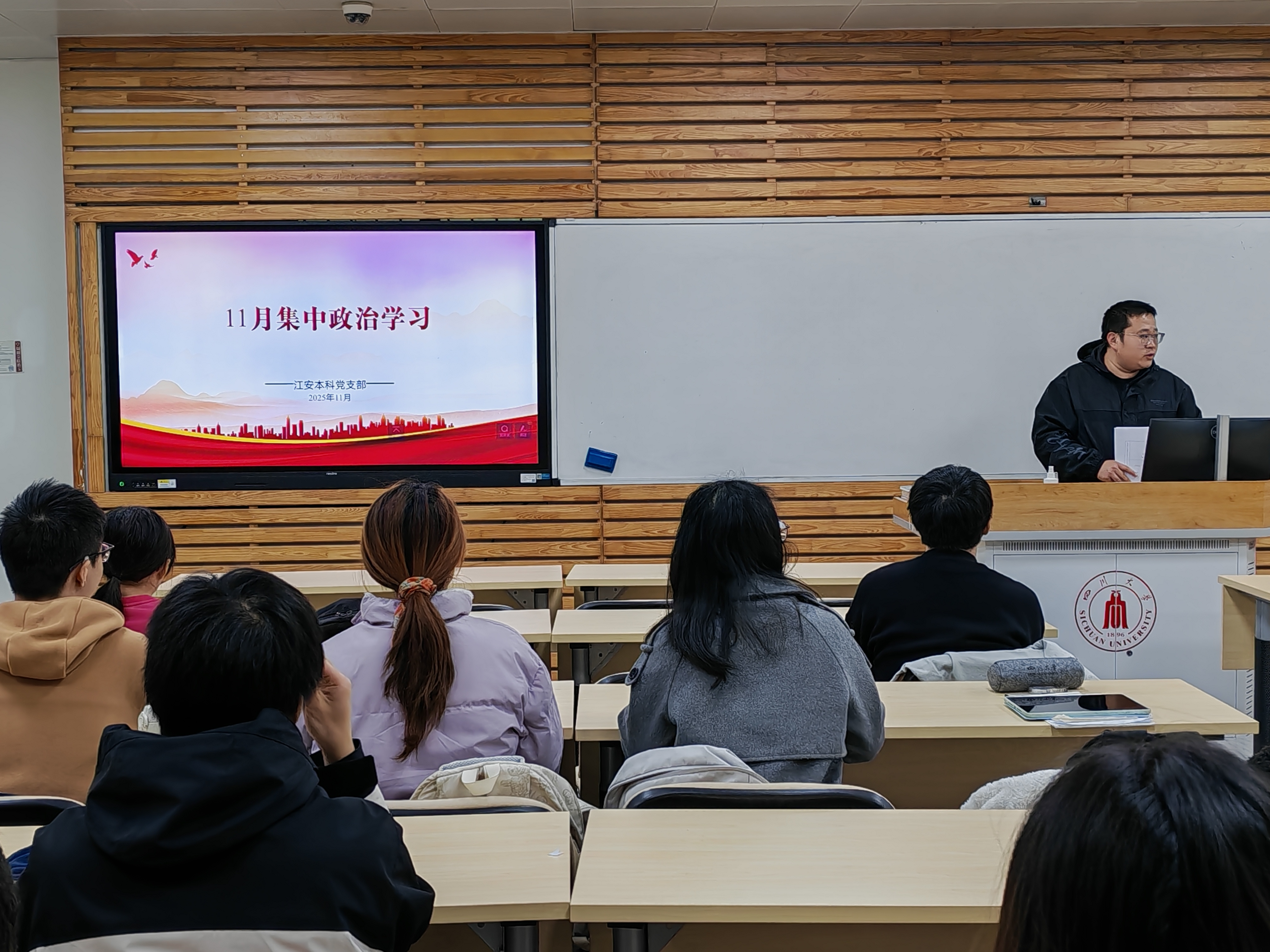 2025年11月23晚,bat365在线体育登录江安本科党支部在望江校区基础教学楼A308组织开展11月集中政治学习、“红途轮忆,青讲党史”主题活动暨读书分享会。支部书记申鑫,支部党员、发展对象部分入党积极分子参会。
