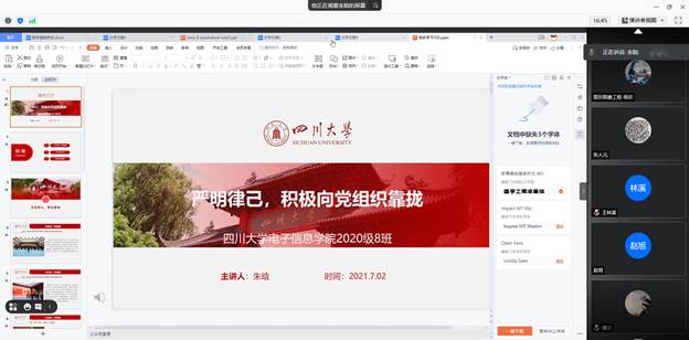 2021年7月2日下午,bat365在线体育登录硕博支部4班和8班于线上举办了以“严明律己,积极向党组织靠拢”为主题的党史学习活动,本次活动由8班团支书朱晗为主讲人,带领4班和8班的同学们学习英雄人物们的入党故事,并鼓励大家积极向党组织靠拢。