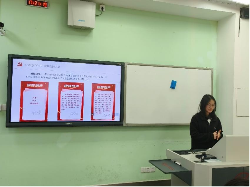 唐璇同志首先带领我们走进榜样故事,感受榜样风采。她讲述了三位榜样的生平事迹和主要贡献,有钱七虎同志为国铸盾,矢志强军;有唐菊兴同志奋战高原,寻矿报国;还有李桂科同志治病治心治贫,让村民更幸福。此外,唐璇同志让我们观看钱七虎同志的奋斗视频,帮助我们汲取信仰力量。这些相关讲话和视频的学习带领大家深化了对党的理论创新的规律性认识,引导各位党员同志更好地走好新时代的“赶考之路”。