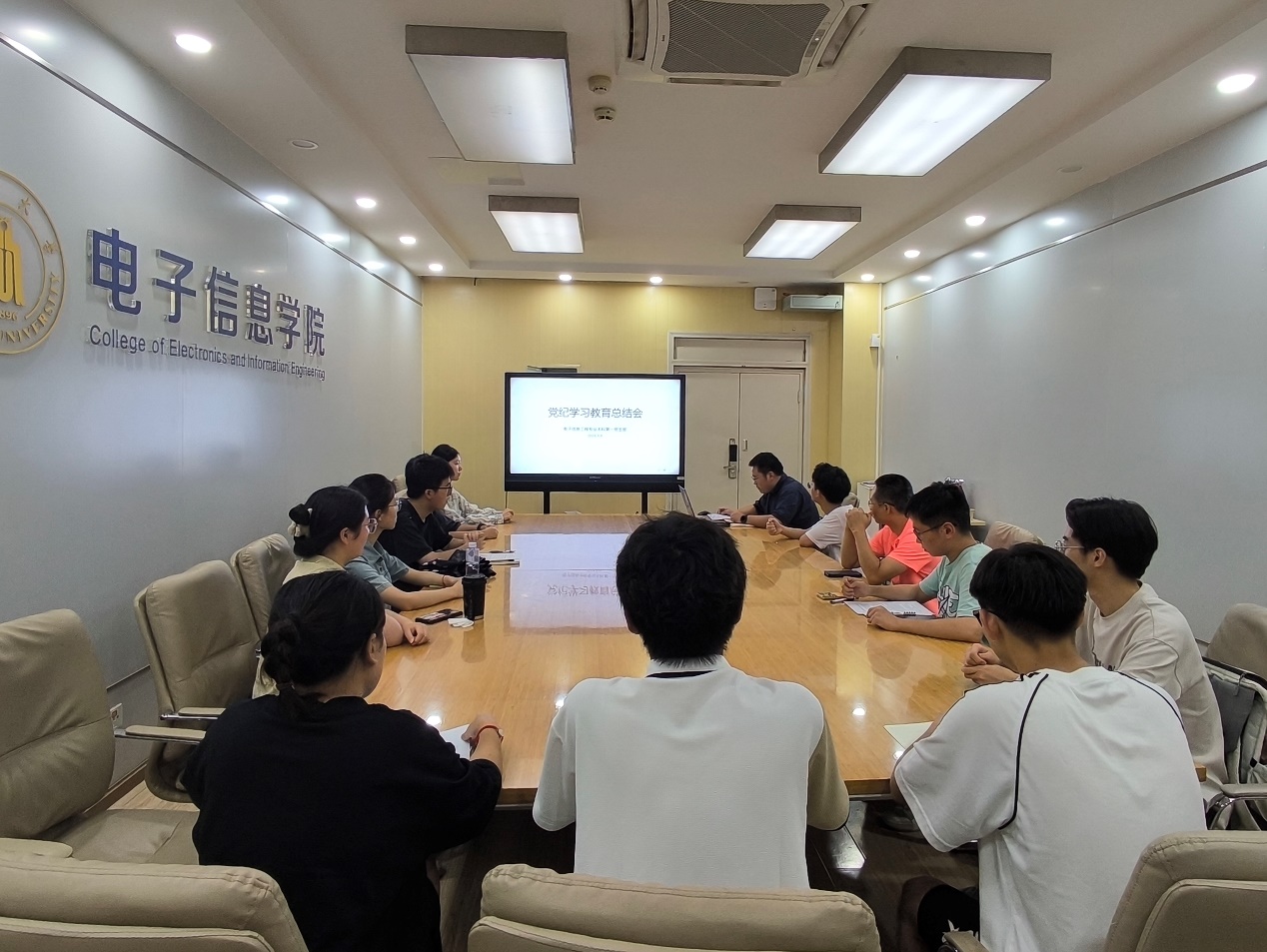 9月8日,电子信息工程专业本科第一党支部在望江校区基础教学楼A110-B会议室召开党纪学习教育总结会,支部书记申鑫主持,支部党员、党员发展对象、部分入党积极分子参会。