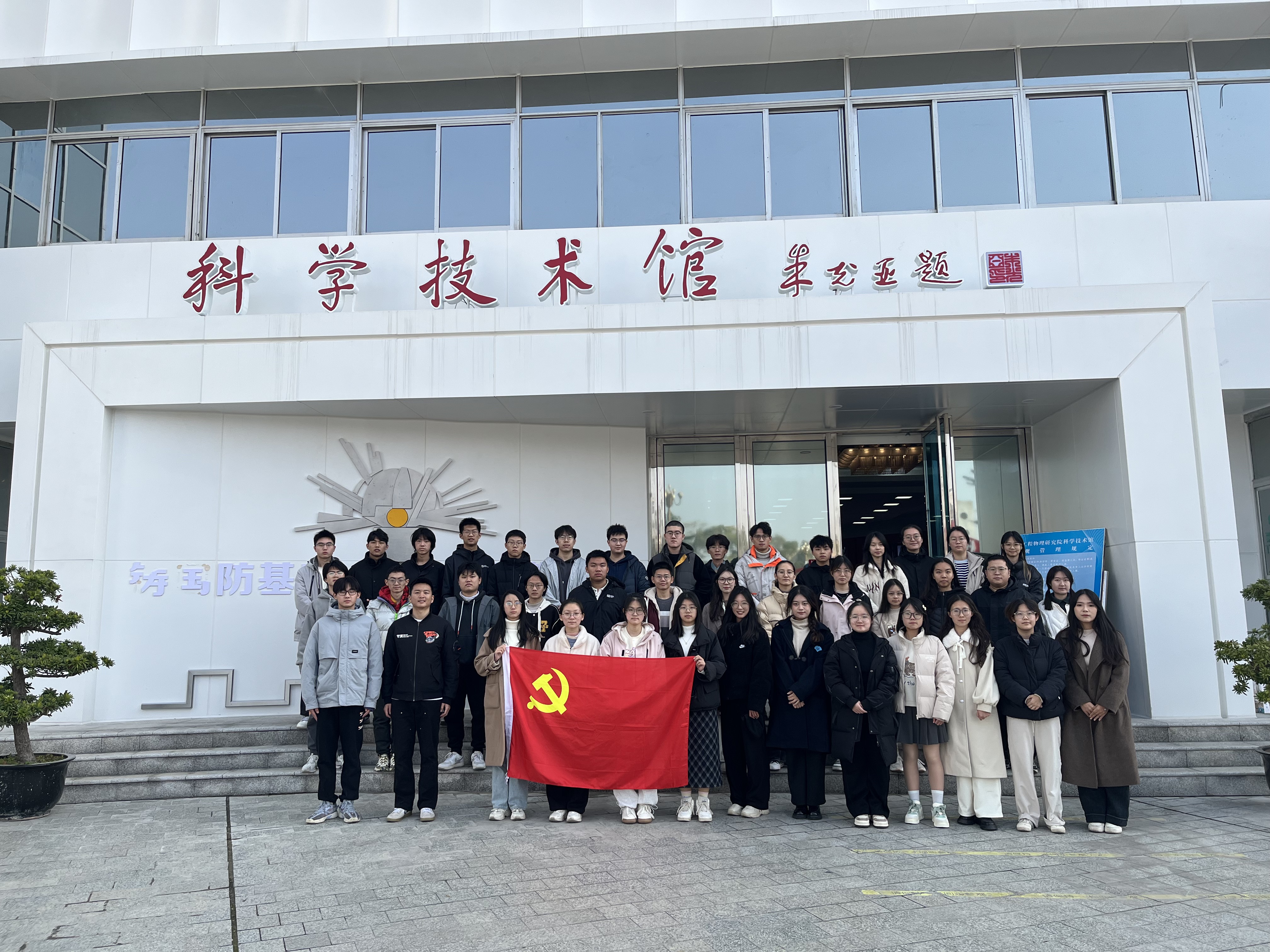 图为师生们于中物院科技馆前合影