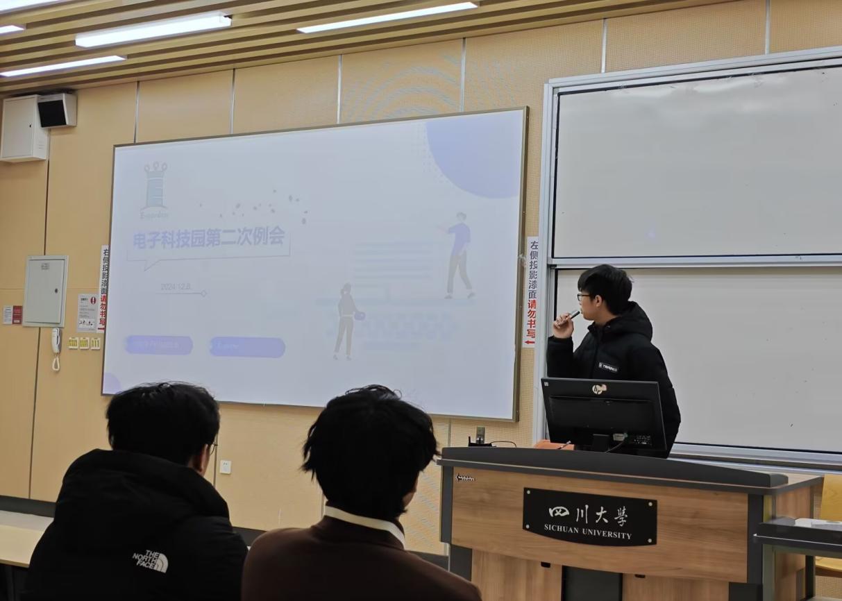2024年12月8日星期日下午15点,bat365在线体育登录电子科技园第二次例会于四川大学江安校区综合楼C座C203顺利召开。电子科技园主席团,技术部、行政部、宣传部、外联部四个部门干部及全体干事参与会议。