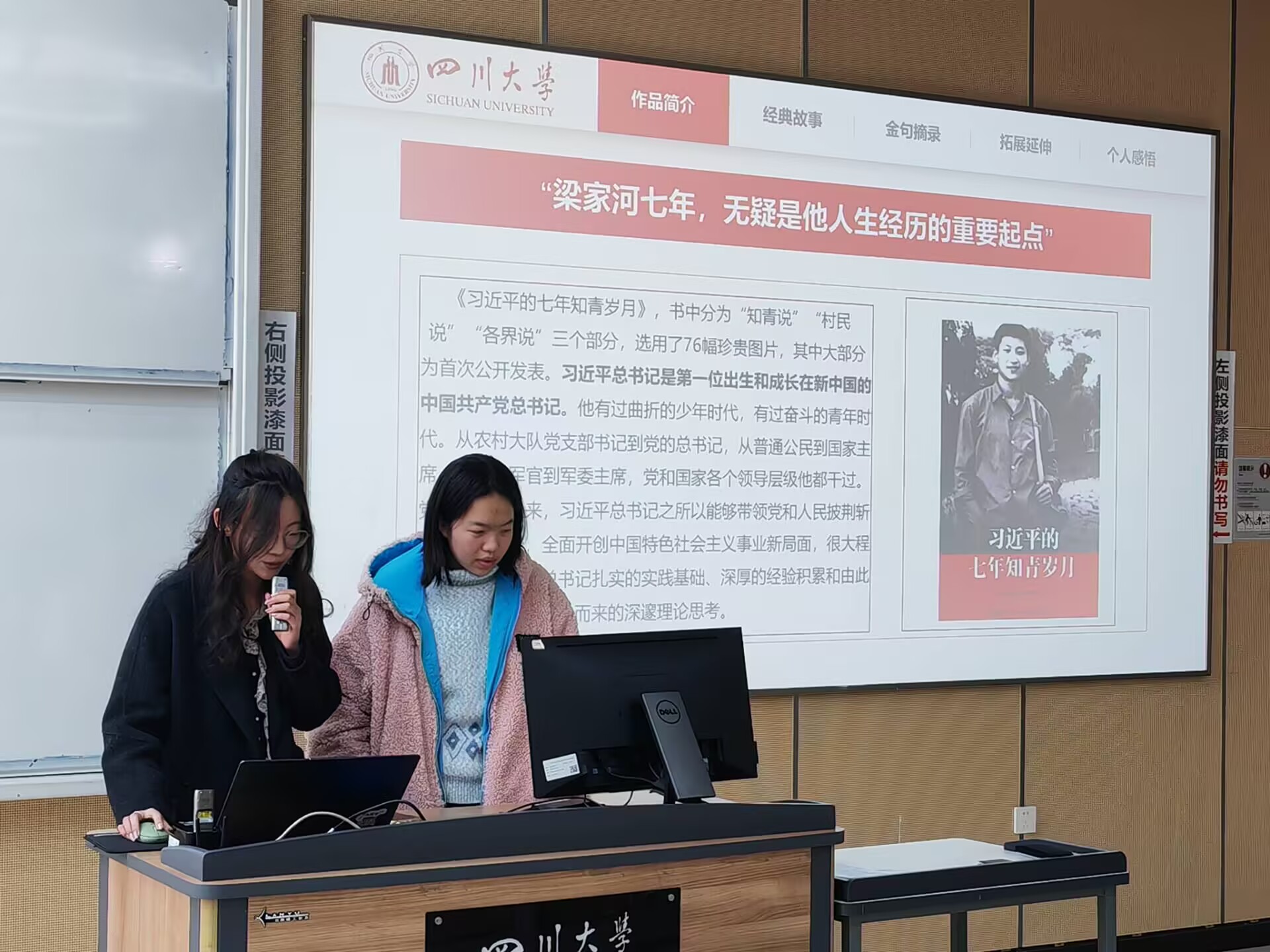 然后,刘昕睿和文迩涵带来《习近平的七年知青岁月》读书分享。她们在背景音乐中,通过多样的形式,展示了读书成果和感悟。刘昕睿向同学们认真细致地介绍了《习近平的七年知青岁月》作品简介、经典故事、金句摘录和延伸拓展部分,文迩涵则站在青年的角度,向同学们交流了自己的收获和启发。
