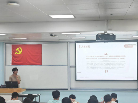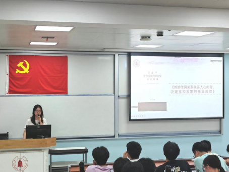 在八项规定学习分享环节,由李可歆、林璐瑶和谭晶晶三位同学从八项规定学习的背景意义、学生工作开展和读原文、悟原理三个方面开展学习分享。
