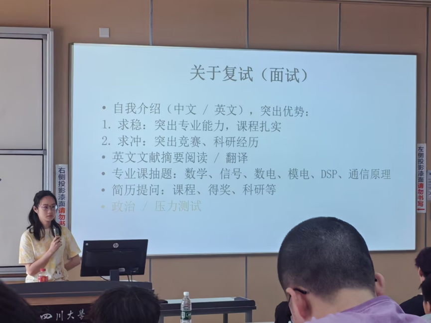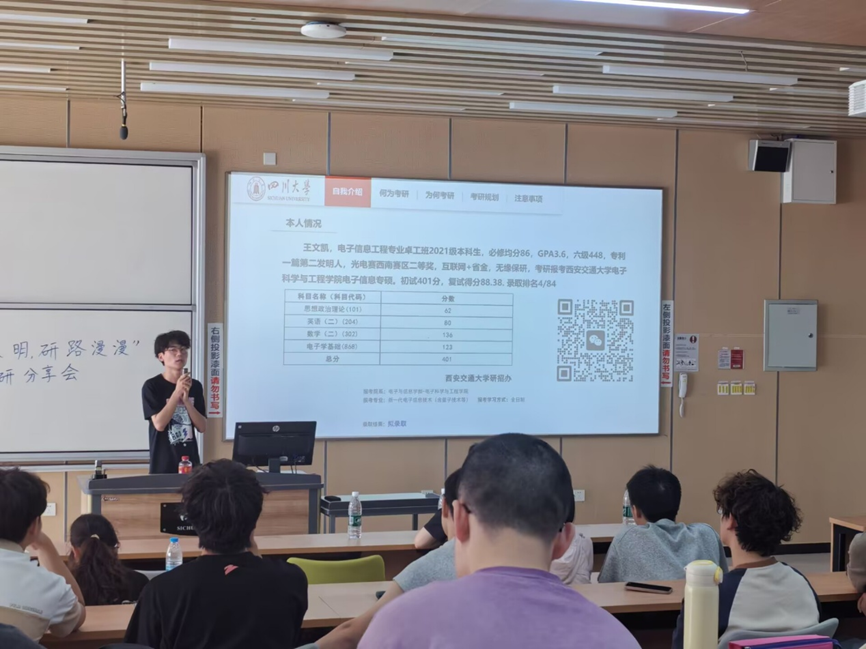 为进一步完善bat365在线体育登录升学指导和就业服务工作,切实加强学院学风建设,聚焦广大学生在不同学段升学发展的具体需求,推动资源共享,争先创优,bat365在线体育登录“星河长明,研路漫漫”考研分享会于5月24日下午在江安校区综合楼c105举办。本次分享会邀请了三名考研上岸的优秀学生分享经验,解答与会学生在考研学习中遇到的疑惑,帮助同学们理性规划考研院校和专业,提升考研技能。