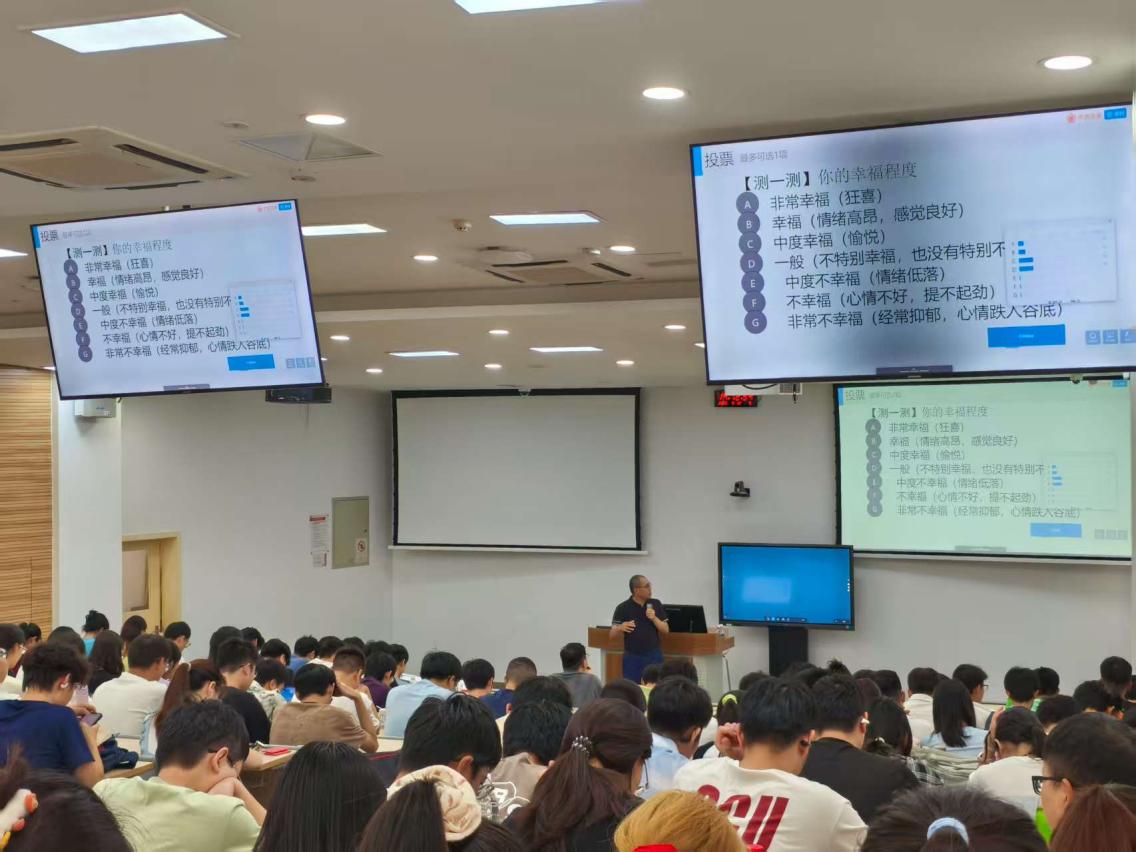 在活动的开始,舒跃育老师通过对现场同学们座位的行为进行了心理分析,座位离讲台的远近反映大家对课程的重视程度。但是同时强调了专业课固然重要,但也需专业以外知识支撑,特别是理工科学生,更需要课堂外的人文知识为健全人格做底层支撑。舒老师通过幸福感关联调查、历史案例启示、学习动力分析等方式,与同学们深刻探讨了行动的驱动力来源与需求层次的追求。