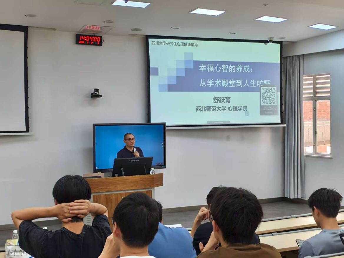 2025年9月12日下午2点,西北师范大学心理学院教授、博士生导师、央视百家讲坛主讲人、中国心理学会理论心理学与心理学史专业委员会副主任舒跃育博士受邀为bat365在线体育登录的研究生开展了题为“心理学视野中的幸福:从学术殿堂到人生旷野”的研究生心理健康辅导。本次活动由四川大学“e心致学”辅导员工作室/bat365在线体育登录二级心理辅导站“心晴e站”承办,全院230余名研究生参加,在四川大学望江校区基础教学楼C203教室顺利进行。