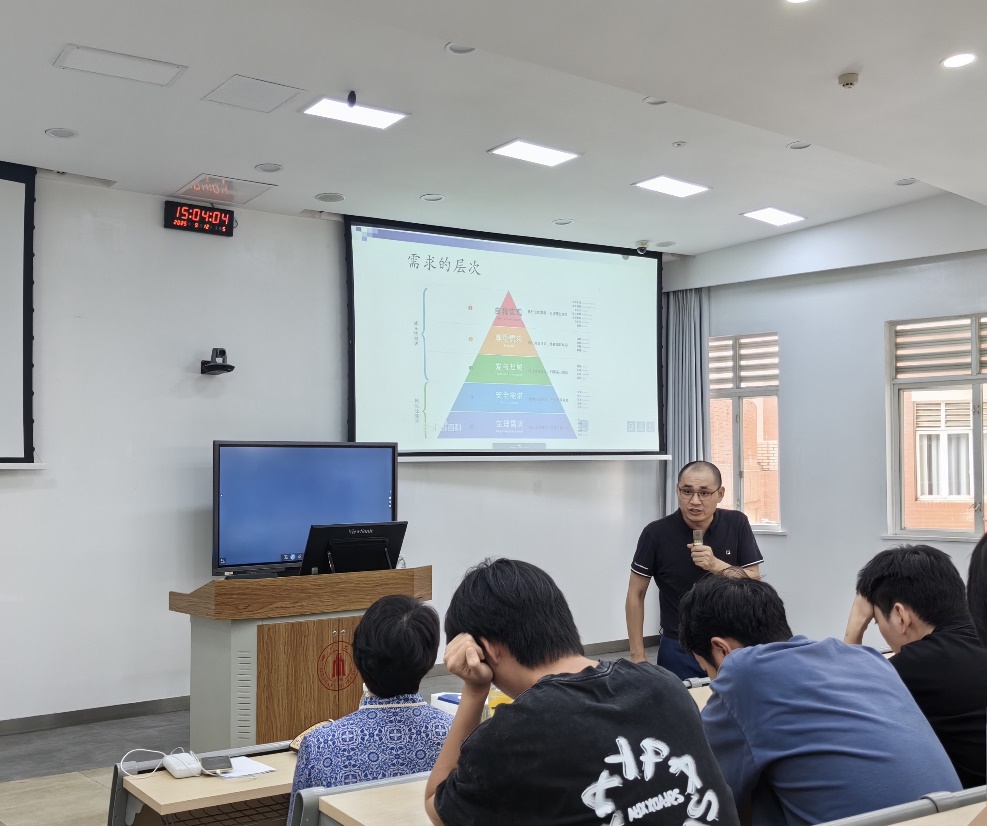 在课堂小问卷中,舒老师发现同学们多数以物质的追求为目标,更偏向于追求外在条件,因此舒老师通过多个案例,向同学们强调了向外寻求是无穷无尽的,并展示了向内寻求价值的重要性,提倡大家向需求的最高层次——自我实现进行努力。