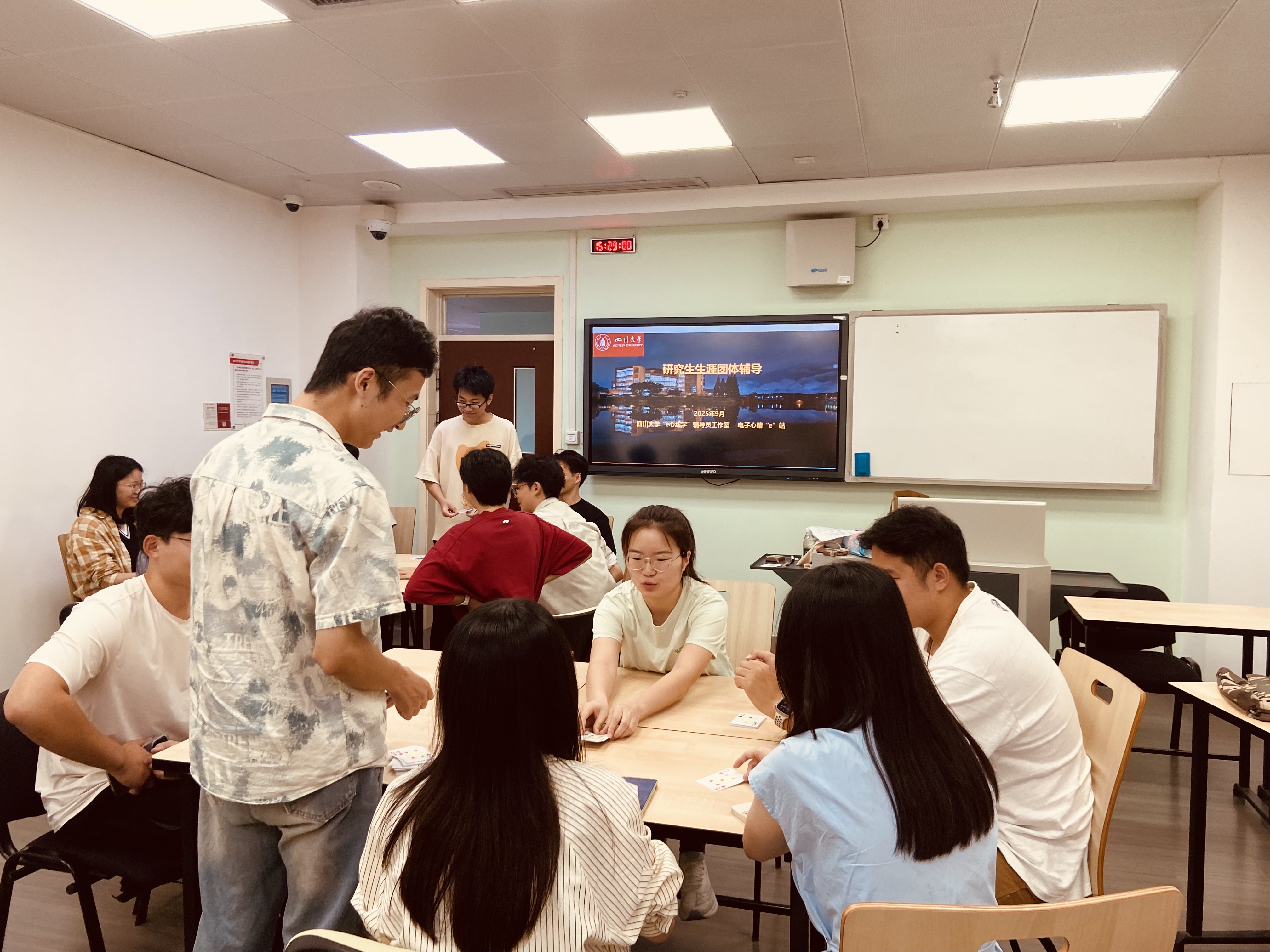 2025年9月24日及25日下午,一场以“面试能力提升与自我认知”为主题的研究生团体辅导活动分别在四川大学望江校区基础教学楼A503教室和A502教室顺利开展。本次活动由何惠老师指导,旨在通过轻松有趣的互动游戏和结构化讨论,帮助同学们缓解秋招压力、提升面试表达能力、增强团队协作意识与自我认知能力。