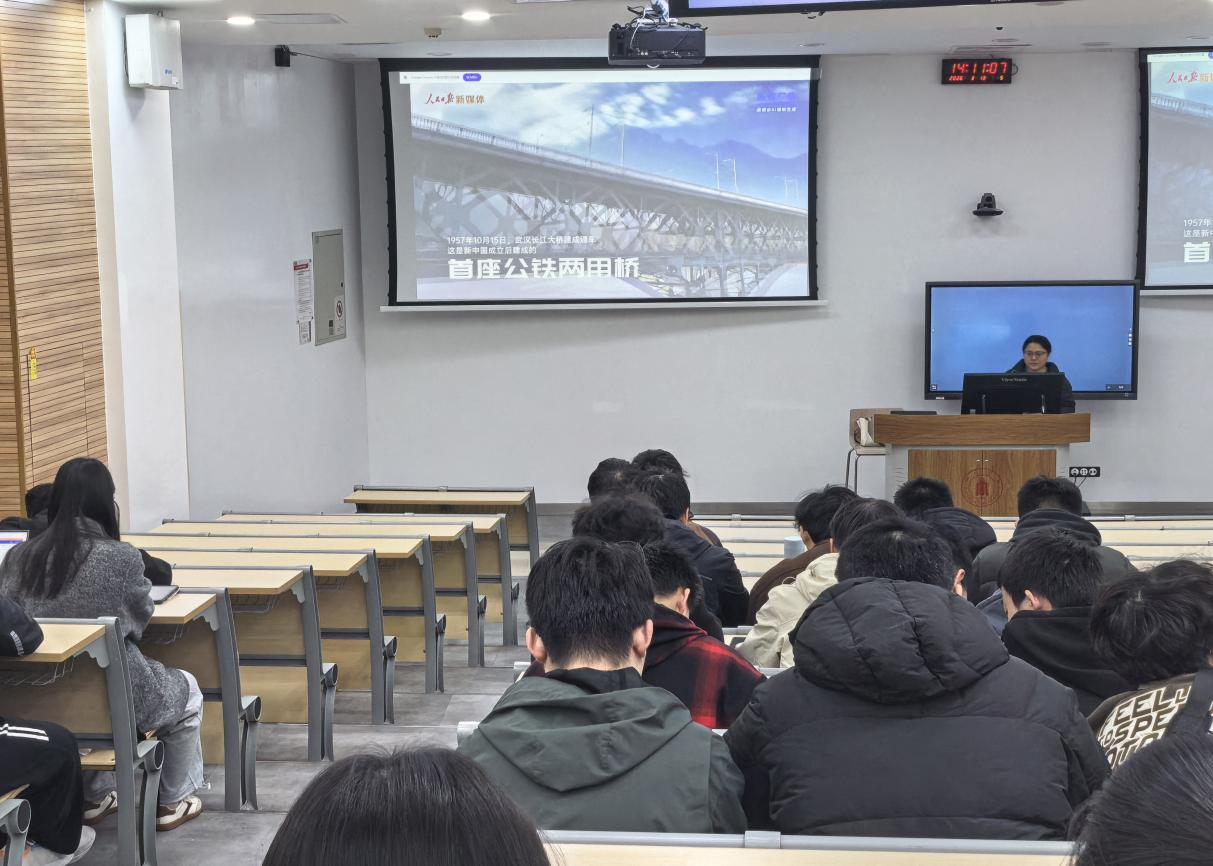 随后,全体学生共同观看了人民日报发布的“起宏图!奋进‘十五五’超燃AI大片!”主题视频。视频用第一视角带领同学们沉浸式穿越山海,直观感受中国以一个个五年规划接续奋斗、再造山河的壮阔历程。从大国重器到民生改善,从科技创新到区域协调,画面中展现的强国复兴画卷令在场学生深受触动。