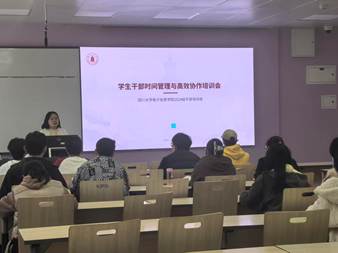 培训会上,年级辅导员陈老师围绕学生干部核心职责,从时间管理技巧、团队协作方法、工作效率提升等方面展开系统讲解,结合日常学生工作案例,为大家梳理了平衡学业与工作的实用策略,强调了高效沟通在班级建设中的重要性。