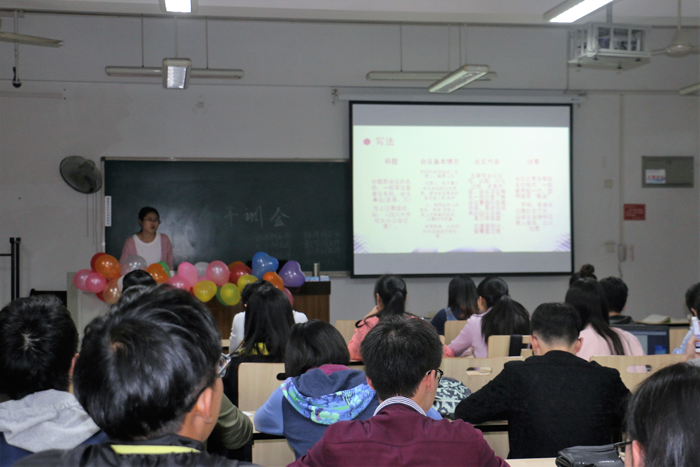 本次干训会是由七个学院联合举办的培训16级学生会新干事的主题活动,以PPT制作技巧与文案策划为主题,为新干事们讲授相关的知识。本次会议立足实际,引导16级新干事们提高自己的能力,学习更多的实用技巧,以更好地投入到学生工作中。相信通过此次培训,2016级的干事们能够以更高的素质、更娴熟的工作技能、更饱满的热情,为全校广大师生提供更好的服务!