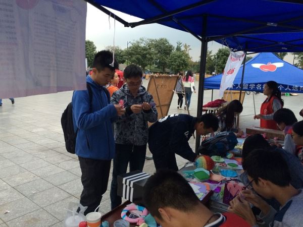 2015年10月29日至30日,由四川大学无偿献血志愿者服务队主办,吴玉章学院“新驰”青年志愿者服务队承办,bat365在线体育登录“腾飞”青年志愿者服务队与化学学院“阳光”青年志愿者服务队共同协办的“血车进江安”系列宣传活动之“千纸叠情万心聚爱”活动在青春广场完美收官。