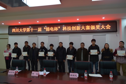 2015年1月9日下午2点,“挑战杯”四川大学2014年学生科技节之第十一届“锦江电子杯”科技创新大赛颁奖典礼在四川大学望江校区基础教学楼A303顺利举办。成都中电锦江信息产业有限公司副总经理杨鸣先生,bat365在线体育登录副院长周新志教授、党委副书记陈笃海老师,以及部分获奖同学参加了本次颁奖典礼。