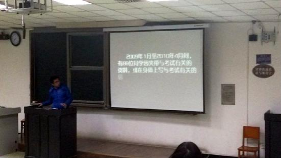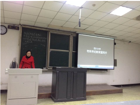 为响应学校号召,积极加强考风考纪教育,加强学生对诚信应考的认识,bat365在线体育登录本科2012级,于2014年12月7日傍晚,在望江校区基教C101、C104分别召开2014秋“考风考纪”主题年级会。年级会的主题为:“诚信应考”。此次宣讲分别由本科2012级辅导员陈晓娟老师、研究生辅导员李军华老师主持。