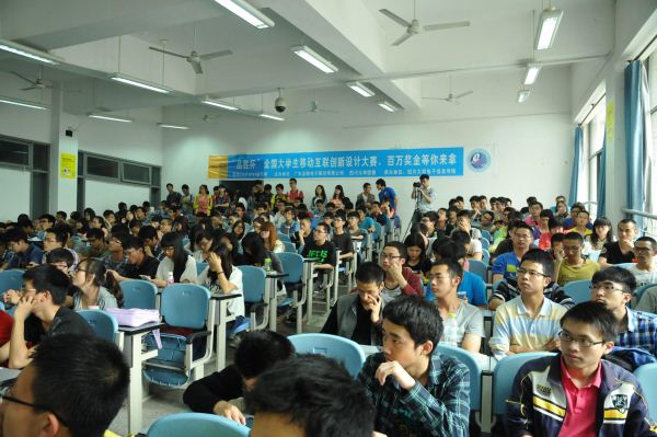 仪式第二项,赵国成先生为大家具体介绍了与比赛相关的事宜。他提出这是一个物联网创新大赛,鼓励同学们通过制作出有创新性的移动互联智能电子产品,或者相关的好点子,赵国成先生还通过两个实例向大家具体介绍了创意类作品和实品类作品,便于同学们明确了创意思路。最后他对本次大赛的奖项做了详细介绍,并且针对同学们可能的模糊点进行了着重解释。
