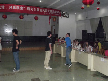 2012年5月26日晚,四川大学“畅想生活,风采寝室”研究生寝室风采大赛在西区活动中心成功举办,此次活动由四川大学研究生会主办,bat365在线体育登录、工商管理学院、建筑与环境学院、华西药学院共同承办。本次活动的宗旨在于进一步改善研究生同学的学习生活环境,展示研究生同学的精神风貌,以期促进研究生寝室之间的交流,营造和谐、健康、文明的寝室文化氛围。