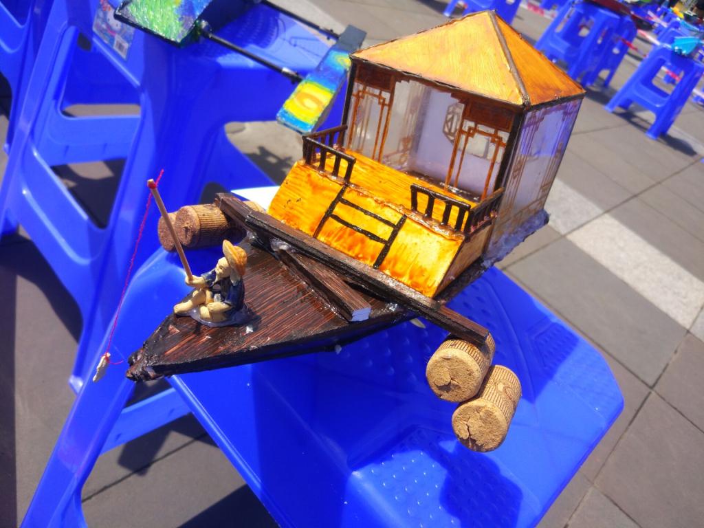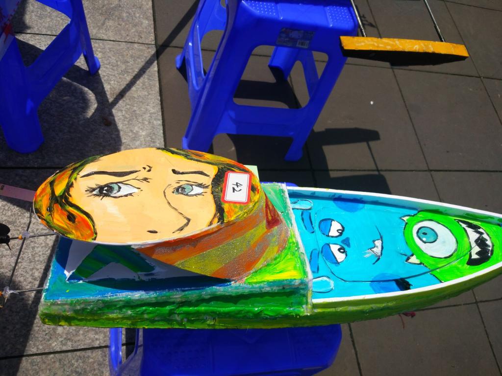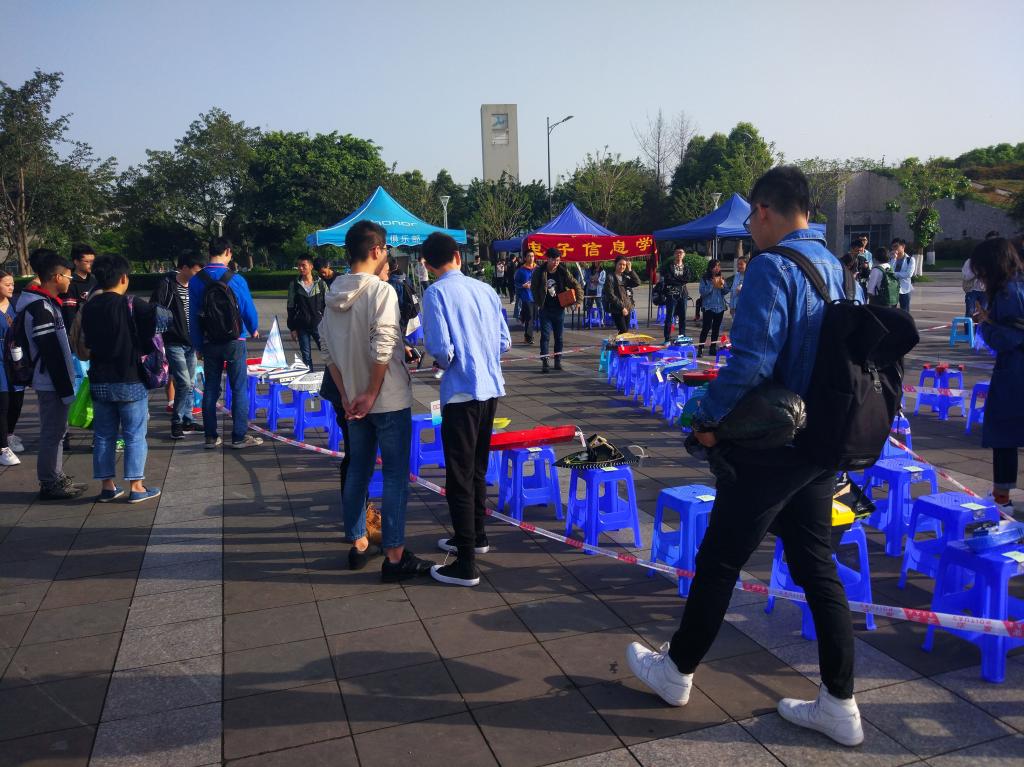41日清晨,天刚蒙蒙亮,干事们便积极地开始了准备工作,在大家齐心协力下,730左右便已将凳子摆好成“w”型,并依次给凳子贴好船号的标签。8:30左右,参赛队员们陆陆续续的到场,将自己队的船体小心翼翼地放到相对应的凳子上。一眼望去,有体型较大的,也有小巧玲珑的;有赛车形状的,也有风筝样的;有老虎花纹的,也有海波浪花的…真是眼花缭乱啊!评委们根据船体的结构,创新、美观和环保程度对船只的外形进行打分。过往的同学也纷纷投来欣喜的眼光,在欣赏过各式各样的船体后,小伙伴们对自己最爱的船模投出一票。一些参赛队员们会向同学精彩地讲解自己船体的独特之处,希望可以拉到这宝贵的一票。