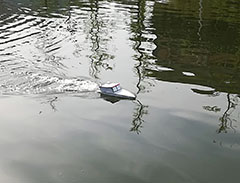 上午短暂的时光匆匆而过,迎来的将是下午激烈的角逐。下午200,比赛正式开始。一声哨响,第一只船出发了。在选手小心谨慎的操控下,船或者加速前行,或者减速拐弯,途中还要绕过四个浮标。评分人员根据船完成比赛所用时间,中途碰撞、超出区域的次数进行打分。紧接着,按照排序,一只只船开始了自己的航行。在这场激烈的比赛中,一些船脱颖而出,不仅美观个性,而且参赛中加速减速,流畅顺利,浮标岸壁,一次未碰,赢得大家一致称赞,拍手叫好。一些船,虽然在中途有一些小碰撞,但在小心操控下,也顺利地完成了比赛。当然,也有一些突发状况。一些船体在参赛前出现了故障,需要临时修改,便不得不延迟参赛;一些船在参赛中意外沉水,或者静止不动,同学们便及时帮忙打捞;而有的船因为马力过大,不受控制,冲向岸边。面对这些突发状况,同学们虽然显得有些焦急,但也在有条不紊的改进着自己的船,高效地解决问题,重新参赛。就这样,不知不觉,比赛进入尾声。
