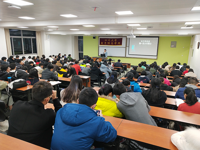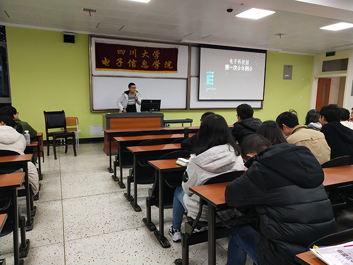 2019年3月2日,由电子科技园模拟电子设计协会第一组、电子科技园模拟电子设计协会第二组、电子科技园嵌入式协会、电子科技园光电设计协会、电子科技园飞思卡尔协会、电子科技园多旋翼飞行器(第一组)、电子科技园多旋翼飞行器(第二组)、电子科技园数字电路设计(第一组)、电子科技园数字电路设计(第二组)主办,电子科技园第一组、电子科技园第二组、电子科技园第三组、电子科技园第四组、电子科技园第五组、电子科技园POV协会第一组、电子科技园POV协会第二组、电子科技园船模协会第一组、电子科技园船模协会第二组、电子科技园电子设计竞赛(第一组)、电子科技园电子设计竞赛(第二组)、电子科技园电子设计竞赛(第三组)、电子科技园电子设计竞赛(第四组)、电子科技园信息安全保密协会、电子科技园信息安全协会(第一组)、电子科技园信息安全协会(第二组)、电磁智能车协会、物联网实践与创新协会网络技术协会协办的电子科技园第一次例会在四川大学江安校区第一教学楼B座举行。电子科技园主席团、部长团以及全体干事参加了此次例会。