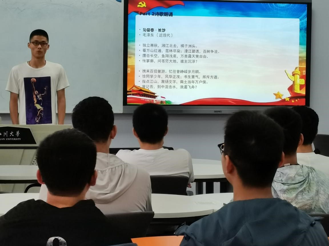 主题团日活动共分为五个部分。第一部分是歌唱团歌,全体同学伴着声声音乐自豪地唱完了团歌。第二部分是团员侯小楠带来的有关先辈崇高精神的诗歌朗诵,朗诵的气势磅礴,激起了同学们的豪情壮志。第三部分是团员洪豪带来的有关英雄王右木的英勇事迹诵读,使同学们进一步感受到了先辈的崇高精神,同时也被先辈的爱国、英勇、负责深深撼动。同学们一起纪念英雄,铭记的是他们的事迹,传承的是他们的精神。第四部分是理论学习,同学们在团支书李任丽的讲解下,一起认真学习了习近平总书记七一重要讲话精神的六大亮点,并且积极参与后续的知识竞争答题,大家表现良好,发挥稳定,团结协作,让活动进入了高潮。第五部分,团支书李任丽根据每个小组的答题分数选出获胜的小组并进行了颁奖仪式,活动到此结束。