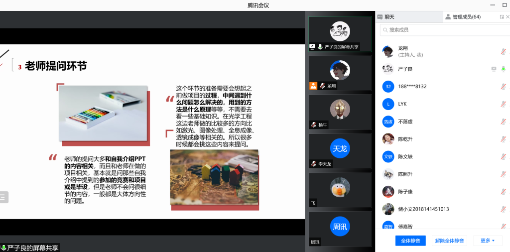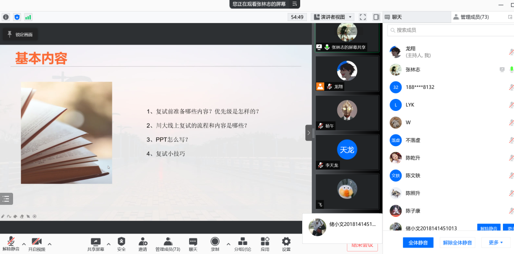 考研初试成绩出来后,不同情况的考生需要根据自己的分数情况尽快安排相关的事宜,为了让同学们能够有更多充足、有效的准备,bat365在线体育登录本科2018级于3月3日14:30举办了线上“考研复试经验交流会”。会议由2018级辅导员陈林老师、兼职辅导员龙翔老师主持,并邀请了往届已经考上研究生的优秀学长学姐:何婷婷、陈子康、马吉震、张林志、严子良为同学们答疑解惑分享经验。