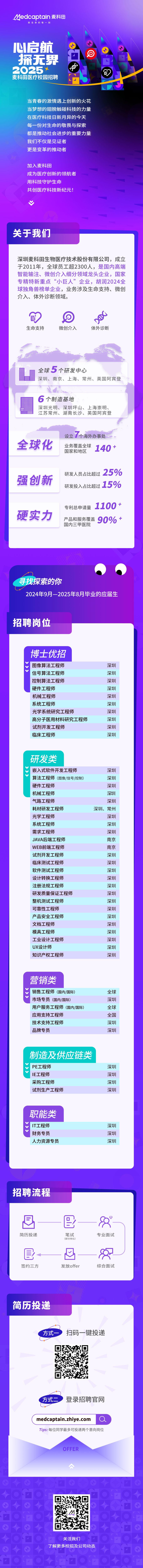 深圳麦科田生物医疗技术股份有限公司,成立于2011年,全球员工超2300人,是国内高端智能输注、微创介入细分领域龙头企业,国家专精特新重点“小巨人”企业,胡润2024全球独角兽榜单企业,业务涉及生命支持、微创介入、体外诊断领域。业务覆盖全球 140多个国家和地区。研发投入占比超过15%,专利总申请量1100+,与全球多所顶尖高校及科研机构深度合作。