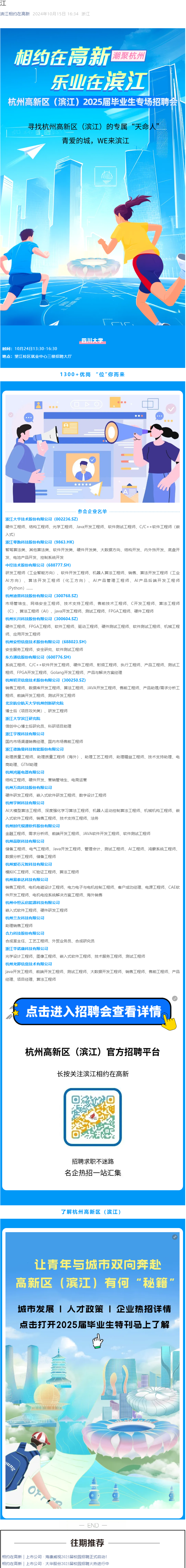 10月24日13:30在就业中心3楼杭州高新区组团招聘会共24家企业推出1300+个岗位需求