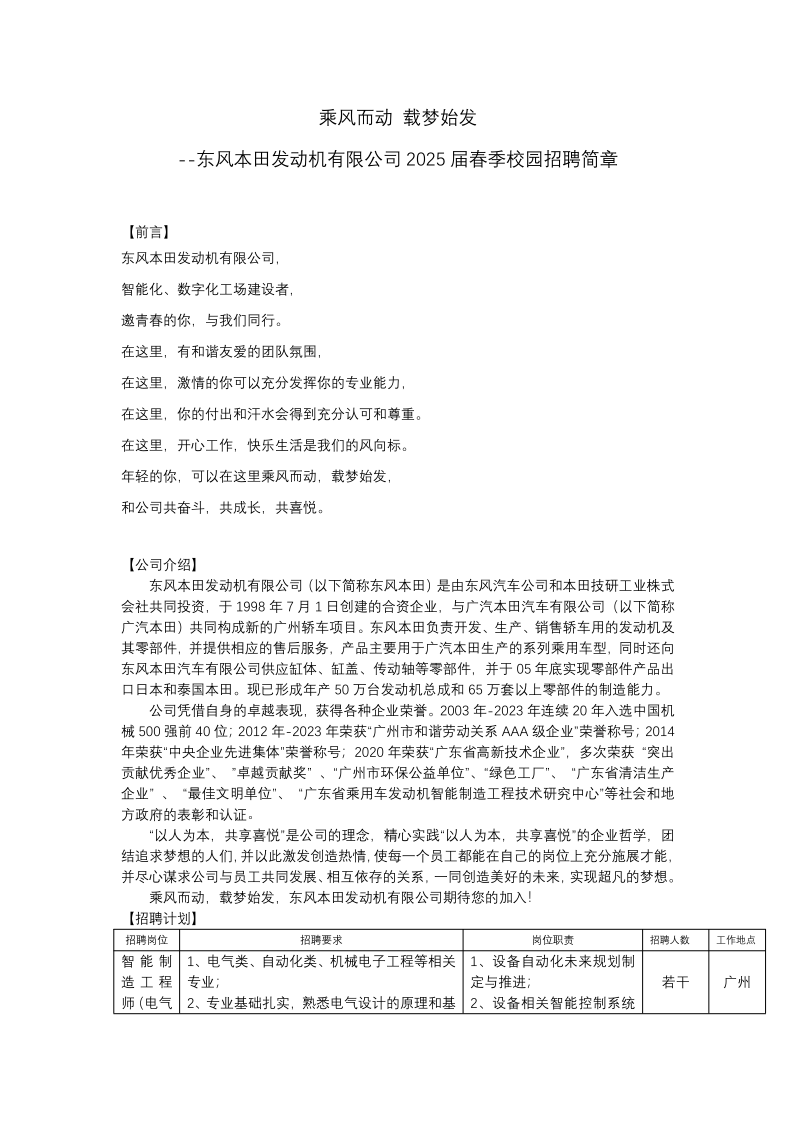 东风本田发动机有限公司2025届春招
