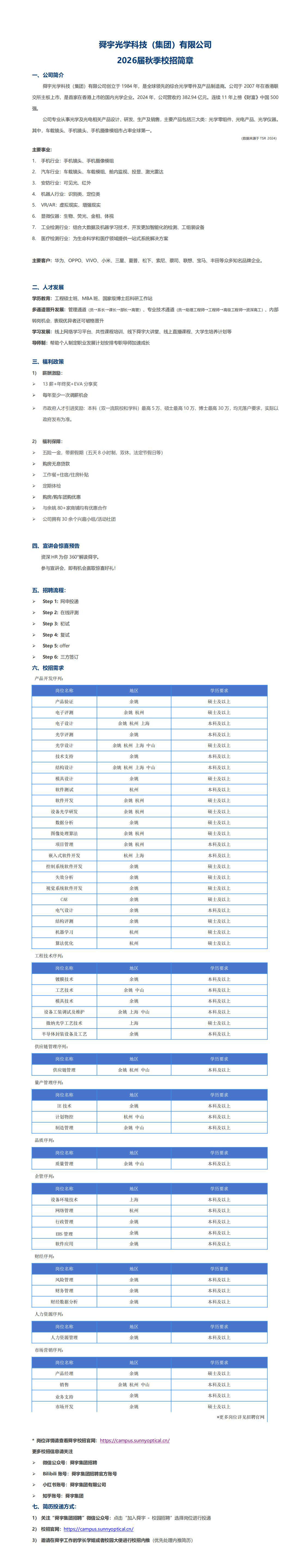 舜宇光学科技集团,下周三9月17日上午10:00基础教学楼A308专场招聘会