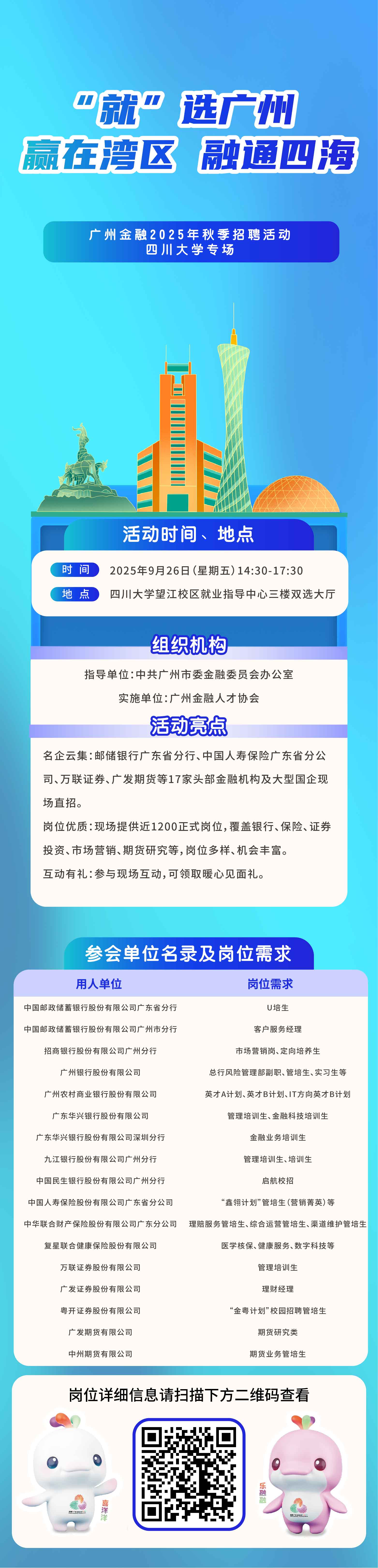9月26日(星期五)14:30-17:30 四川大学望江校区就业指导中心三楼双选大厅 广州金融招聘会