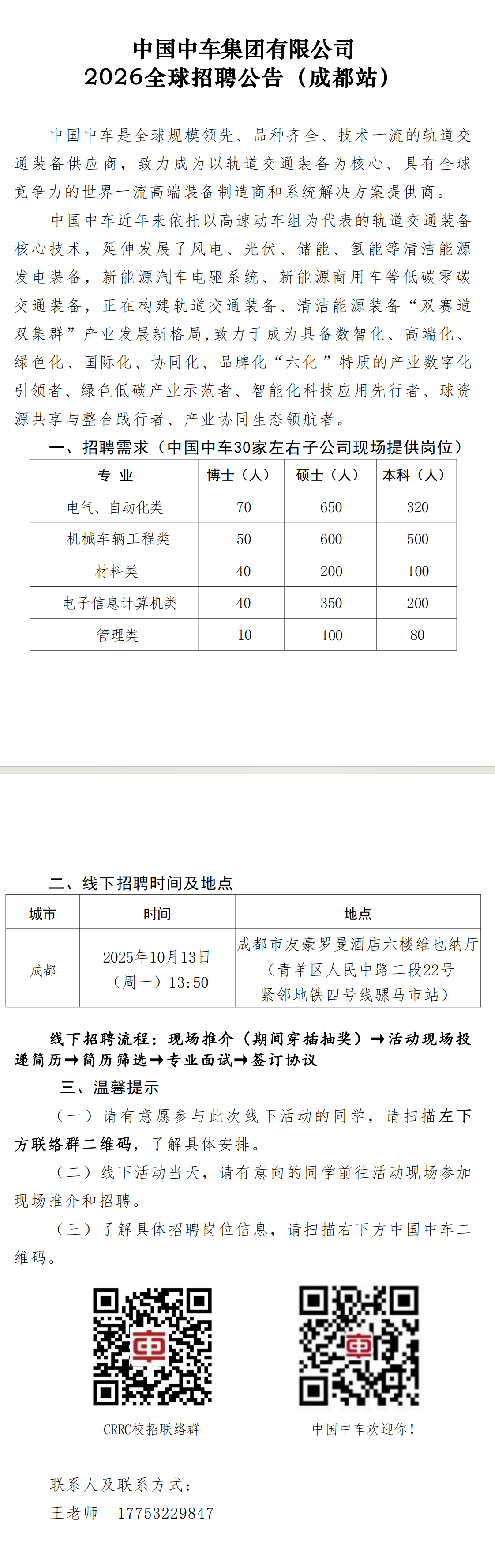 10月13日13:50成都市友豪罗曼酒店六楼维也纳厅 中国中车集团2026全球招聘