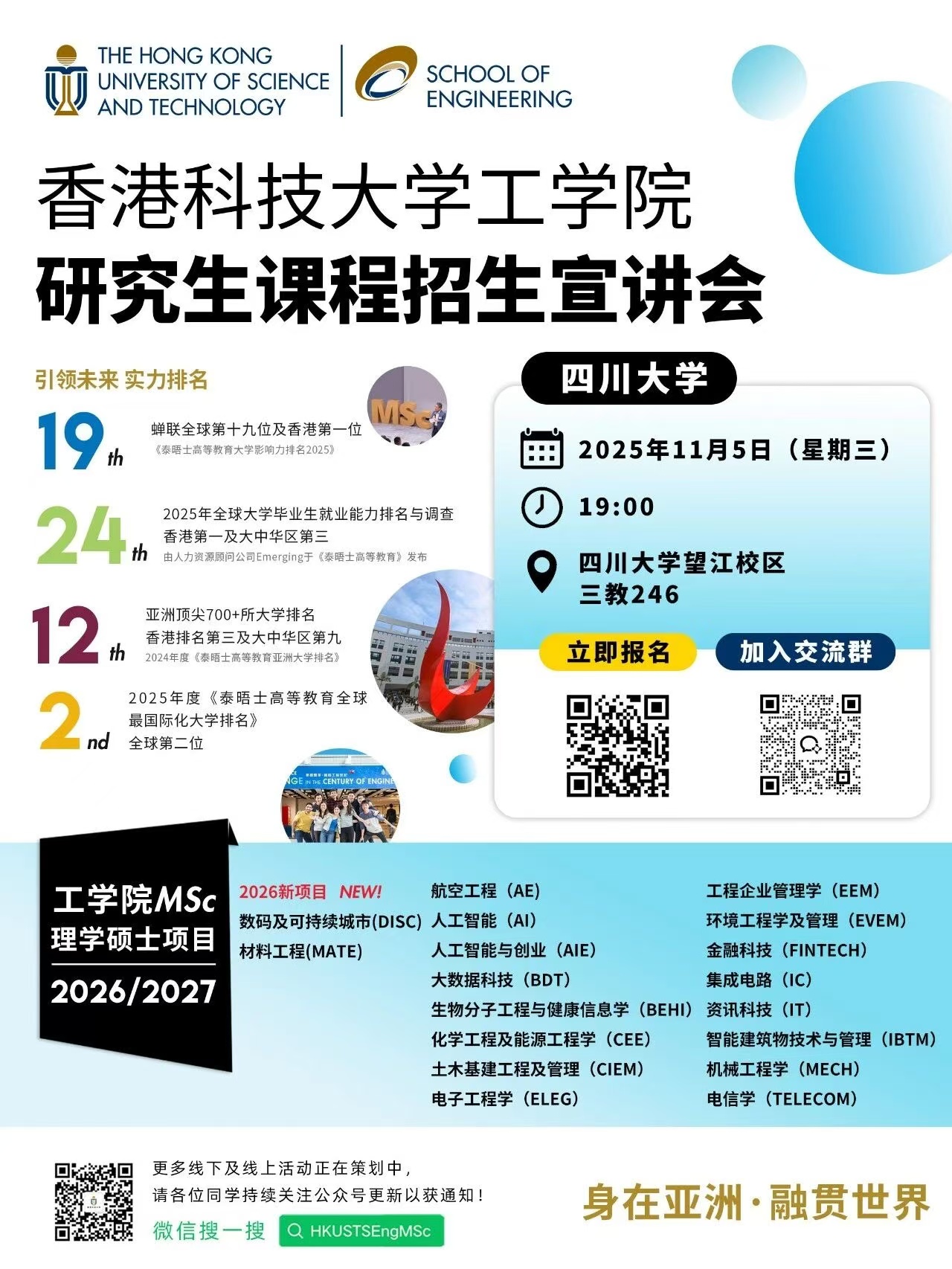 🔔香港科技大学工学院2026/2027年度研究生课程招生宣讲会-四川大学专场