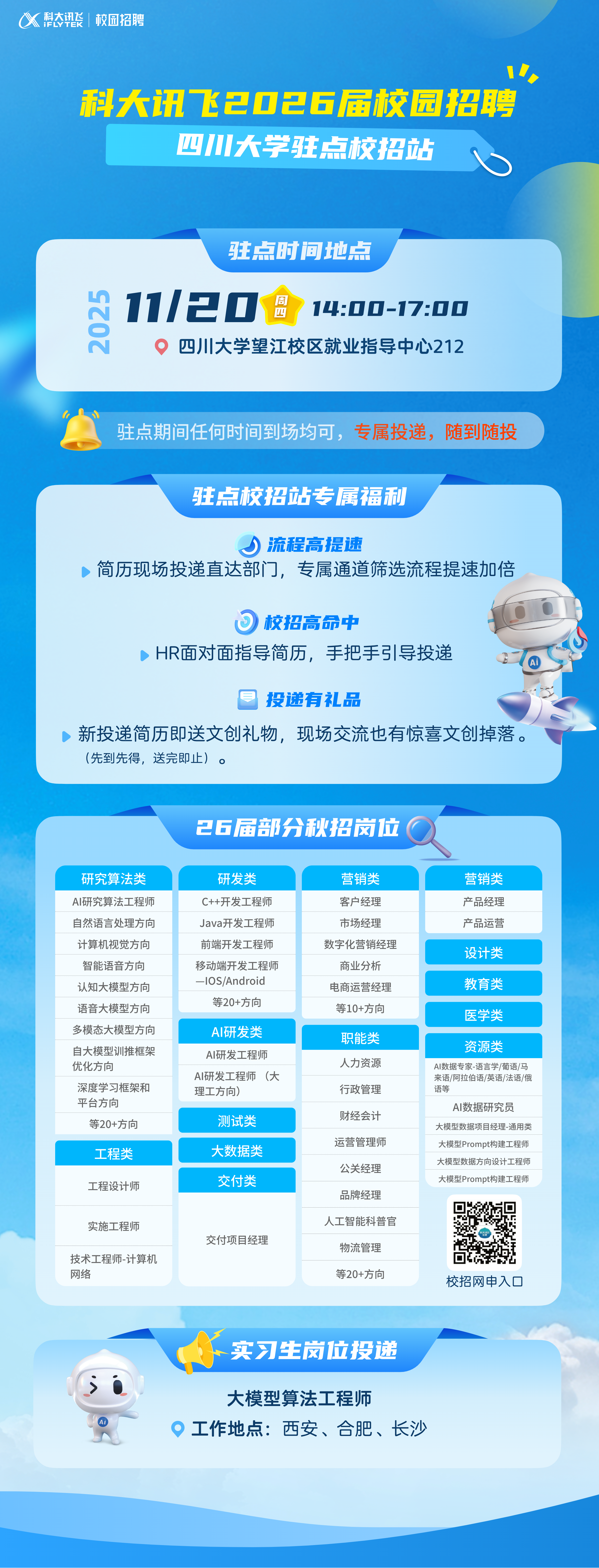11月20日 本周四(明天)下午2:00 望江校区就业指导中心212 科大讯飞26届校园招聘HR面对面活动
