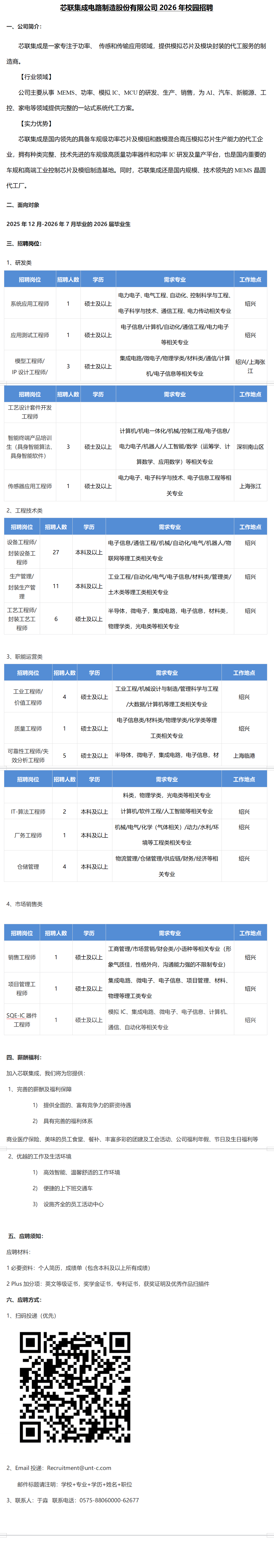 芯联微电子制造股份有限公司2026年校园招聘
