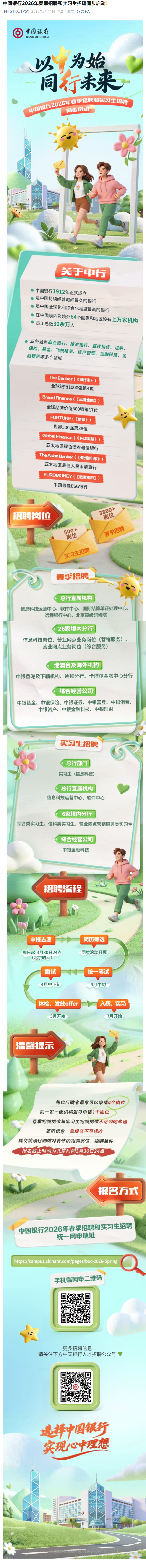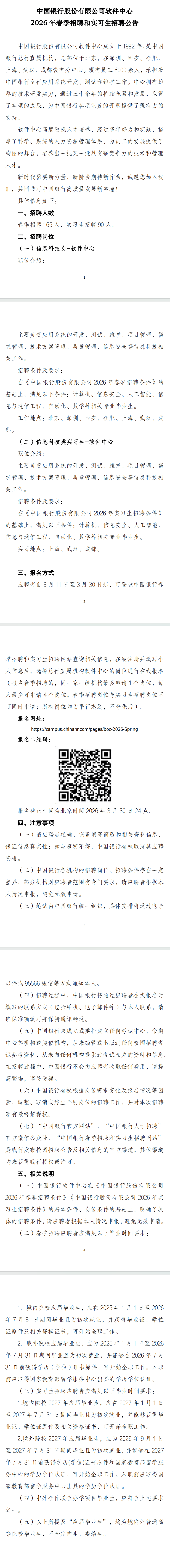 相关详细信息可查阅《中国银行股份有限公司软件中心2026年春季招聘和实习生招聘公告》pdf,欢迎大家积极投递~~~
