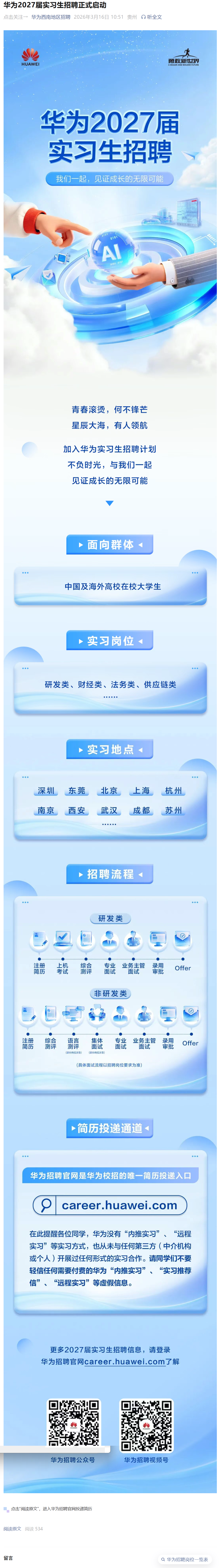 华为27届应届生实习招聘快开始啦,咱们有师兄在华为海思数字芯片领域工作,可以提供一些岗位、流程等方面的指导。