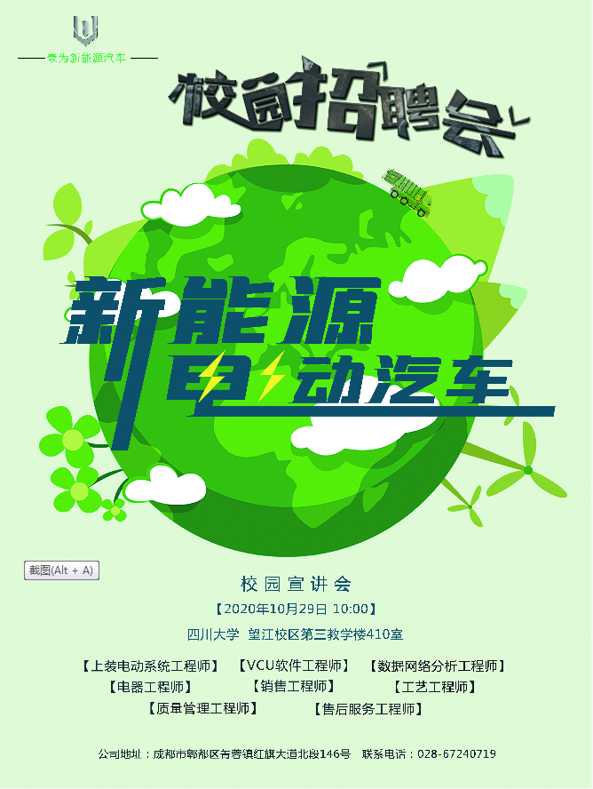 成都壹为新能源汽车有限公司 校园招聘 关于我们 成都壹为新能源汽车有限公司位于成都市双创示范基地-成都市郫都区。壹为汽车是一家专注于专用车电动化底盘设计、电气系统集成及整车控制、智能网联信息技术的研发型科技公司。 壹为汽车积极响应蓝天保卫战,秉承抟心壹志奋发有为的理念,通过“标准化电动底盘+个性化上装电气控制方案+信息化平台服务”组合产品,深耕环卫专用车细分市场,向广大专用车企业提供全系列、全流程、全层次的靶向精准化产品和服务,全面帮助解决传统专用车企业向新能源专用车企业转型。 创意郫都区的一处乌托邦: 舒适、整洁、优质的办公环境, 年轻、友爱、激情的团队氛围。 我们有信仰、有价值观,我们有思想、有活力还懂创造。 我们相信坚不可摧的力量来自于集体,同样也需要造世英雄的您。 我们为有梦想的您提供宽阔的发展平台和空间,大家同是人才,懂得英雄相惜。 在这里,我们有在十余年新能源汽车行业领域沉淀的专业君给您提供一对一的辅导。 如果您是一个有能力有思想有理想有干劲的四有好青年, 那么,加入我们,成为我们的伙伴。 HR方老师:18982170512,邮箱,fangcaoxia@1vtruck.com 赶快投简历