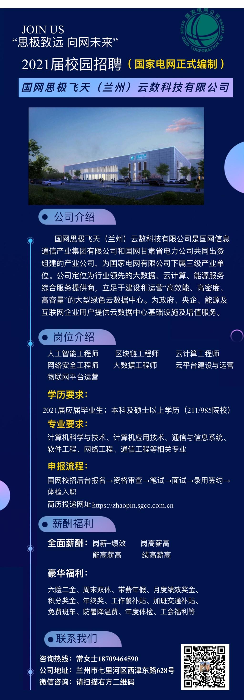 国网思极飞天(兰州)云数科技有限公司(简称:思极飞天)于 2018 年 12月在兰州新区注册成立,公司现有注册资本 9800 万元,是国网信息通信产业集团有限公司和国网甘肃省电力公司共同出资组建的产业公司,为国家电网有限公司下属三级产业单位