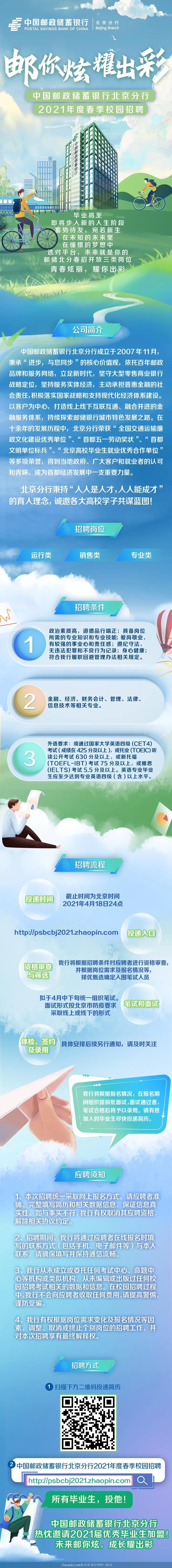 中国邮政储蓄银行北京分行 2021年度春季校园招聘①目标对象:2021届应届毕业生②招聘流程:根据报名情况,组织提前批面试,面试通过者,笔试合格后将予以录用③工作地点:北京④投递链接:psbcbj2021.zhaopin.com