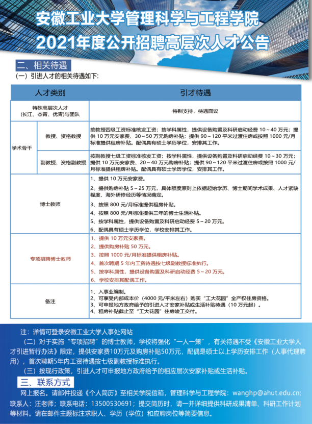 (3)来校3年内获批国家级项目和高水平论文,可另外追加奖励待遇(10-30万元,具体待遇根据预获得成果档次,与人事处在引进时签订协议)