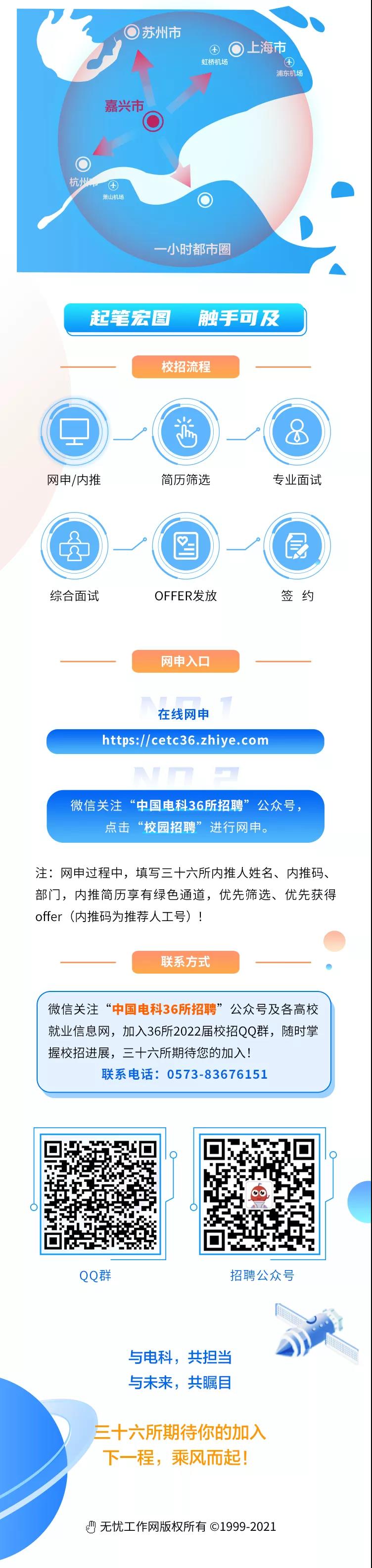 中国电科三十六所2022届校招宣讲会:【四川大学】9月26日15:20-17:20,就业指导中心221室★事业编制、安家费(硕士15-28万、博士35-68万)等福利,具体请登入各高校就业信息网查看,三十六所期待您的加盟!★请携带个人简历及相关材料参加现场宣讲,并完成网申,欢迎邀请其他同学参加现场宣讲会。