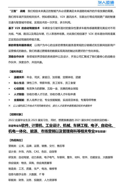 华人运通是由全球一流团队创立的创新型出行科技公司,以“智能汽车、智捷交通、智慧城市”的三智战略为指导,致力于创造面向未来的人类出行方式。