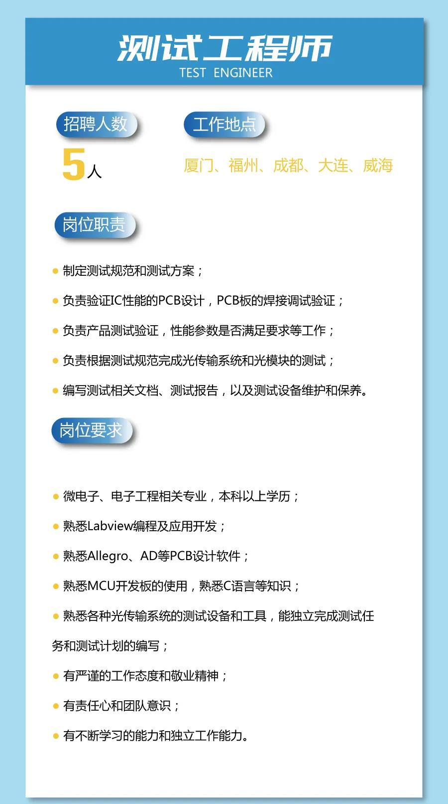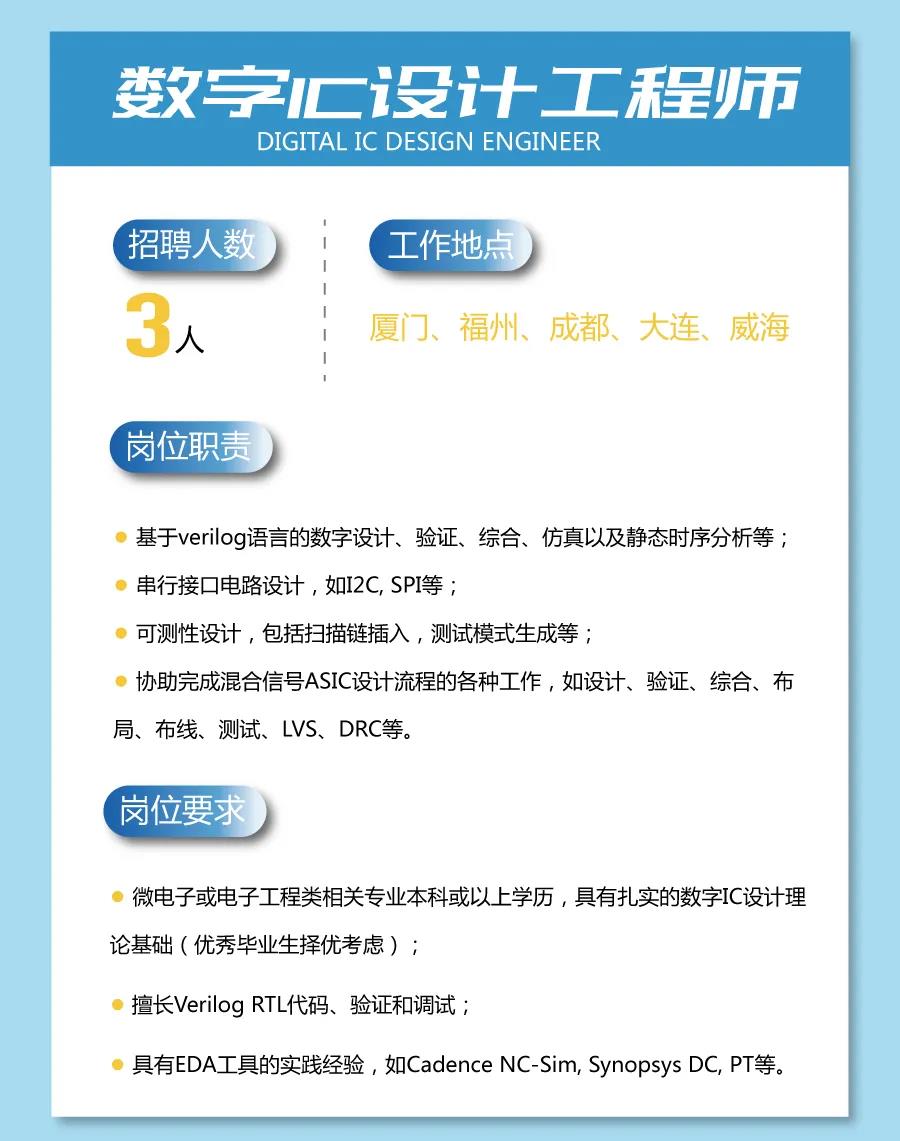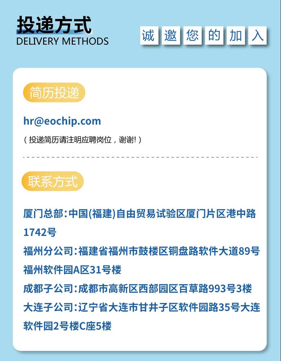 亿芯源招聘测试岗,学过数电和模电就可以,普通高校应届6000-8000,川大和电子科大的本科生的待遇可以谈,月薪10000左右,招本科,测试岗william.huang@eochip.com,有意请投简历到此邮箱