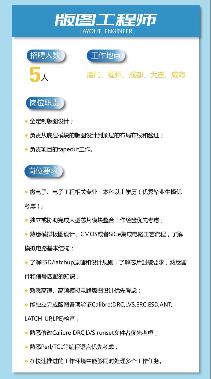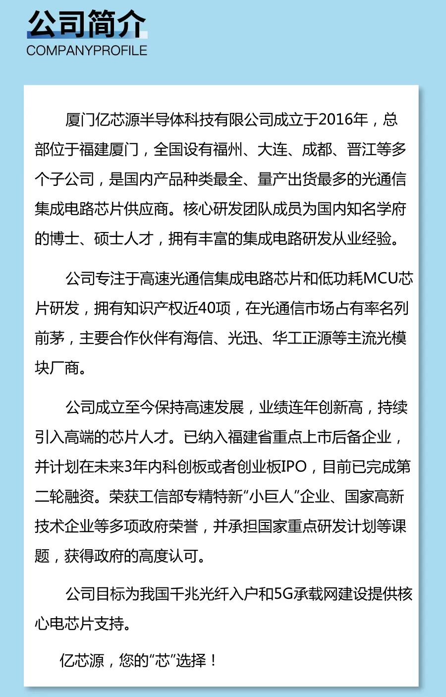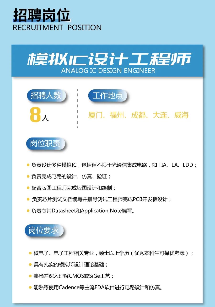 亿芯源招聘测试岗,学过数电和模电就可以,普通高校应届6000-8000,川大和电子科大的本科生的待遇可以谈,月薪10000左右,招本科,测试岗william.huang@eochip.com,有意请投简历到此邮箱