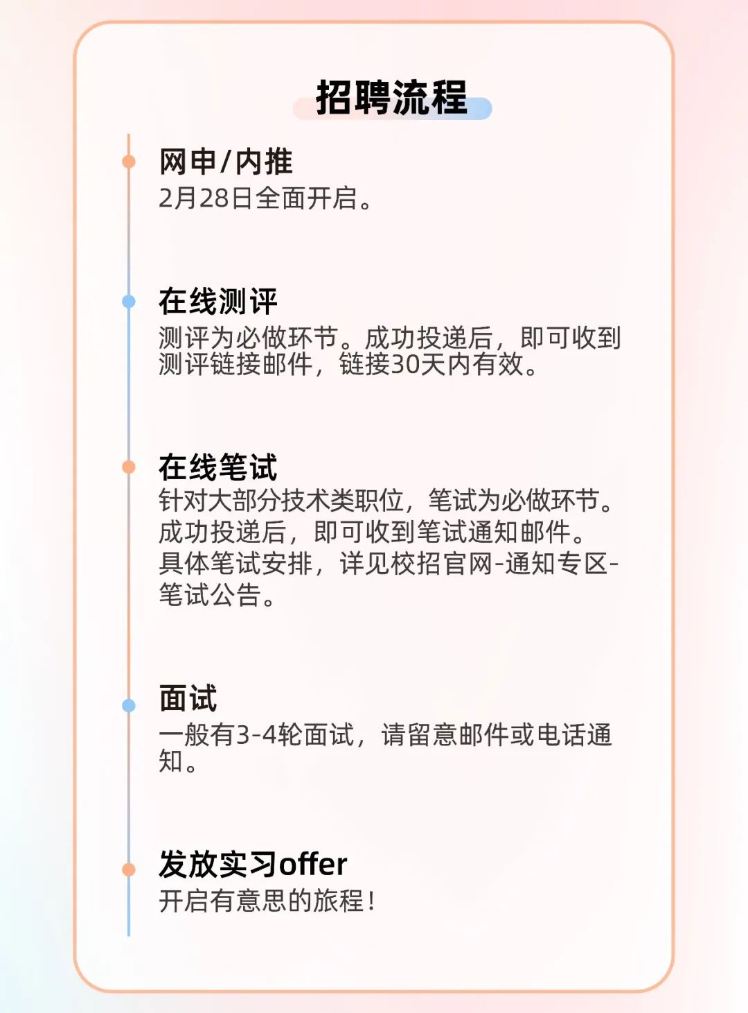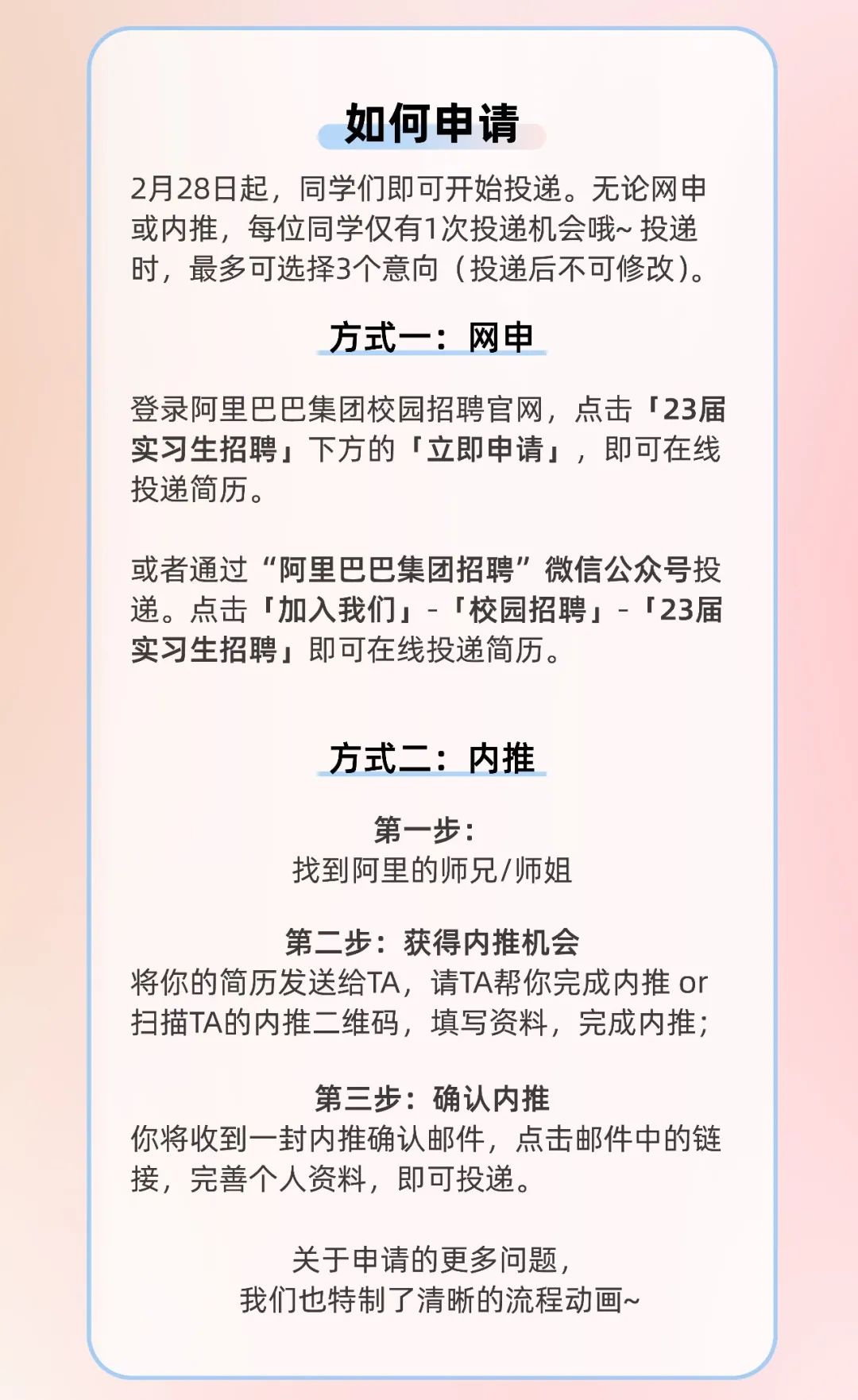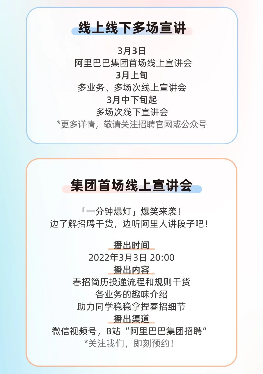 阿里巴巴春季 2023 届校园招聘正式启动!加入阿里巴巴,一起打开有意思的未来!招聘对象2022.11-2023.10毕业的海内外应届毕业生岗位类型技术类:研发类、算法类、芯片类、游戏类等非技术类:运营类、设计类、产品类、营销类、风险管理类、物流类等其他更多职位详见官网,总有一个岗位适合你!