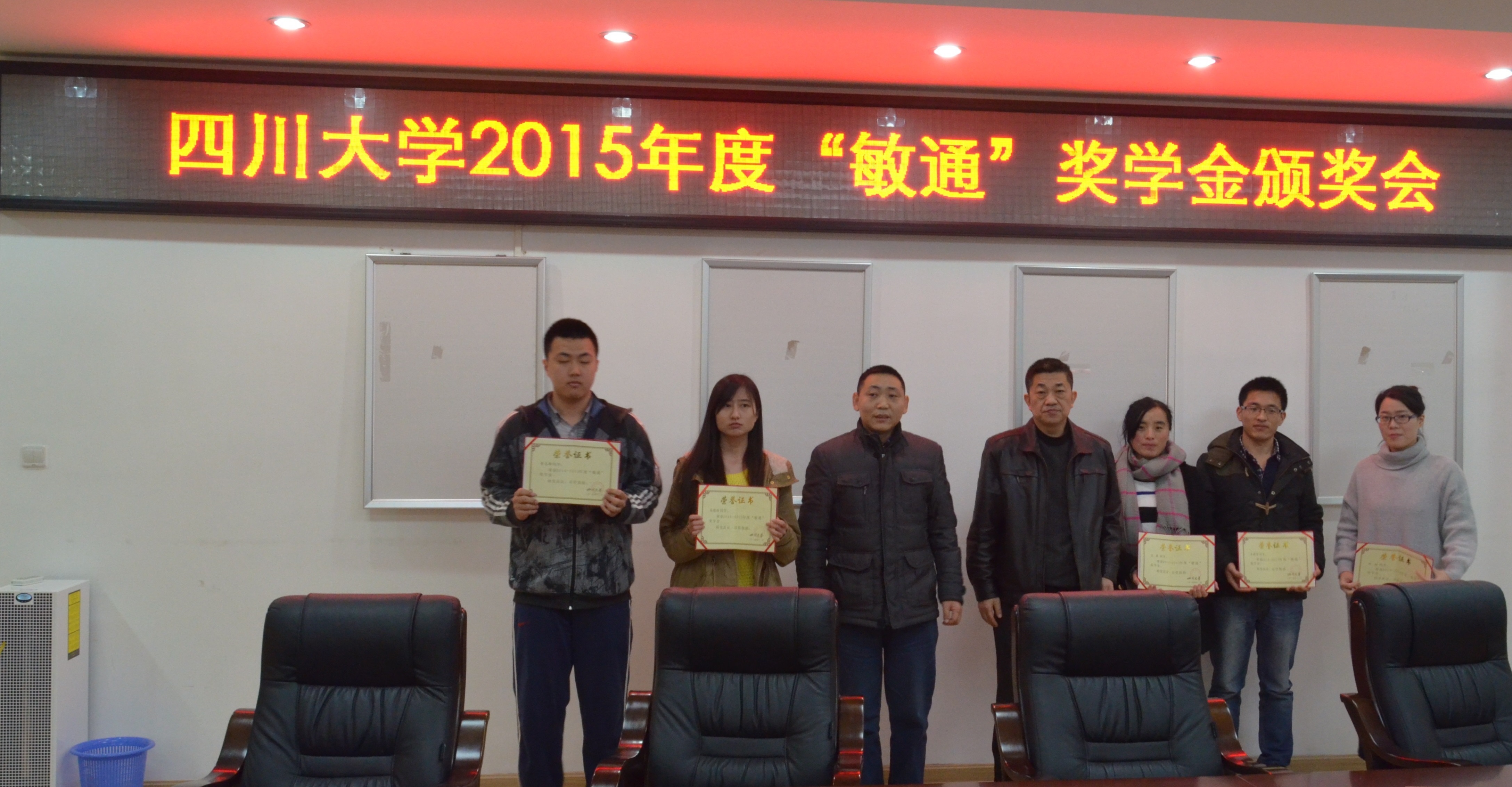 2016年1月8日上午,四川大学2015年度“敏通”奖学金颁奖典礼在望江校区基础教学楼A座303隆重举行。bat365在线体育登录党委蒋斌书记,党委陈笃海副书记,李军华老师及获奖同学出席了本次颁奖典礼。